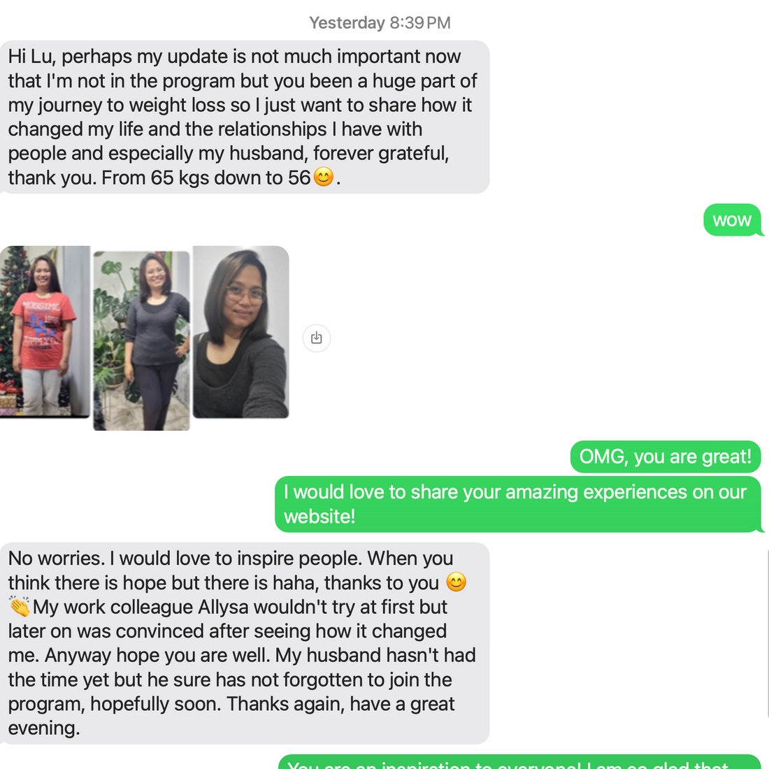 • ジェレリンは2023年10月に変身への旅を始め、当初の体重は81.5kgでした。LOLUヘルス・栄養プログラムからの指導と、献身的な努力と継続的な取り組みを通して、彼女はその後数ヶ月で目覚ましい進歩を遂げました。