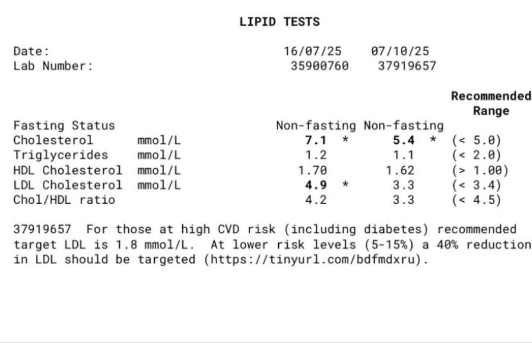 • LOLU™ DASH Plate食事プランに従った結果、彼のコレステロール値は著しく改善しました。総コレステロール値7.1 mmol/Lから5.4 mmol/Lに低下し、 LDL(悪玉コレステロール)は4.9 mmol/Lから3.3 mmol/Lに低下しました。これは、彼の心臓血管疾患のリスクが低下したことを意味します。HDL (善玉コレステロール)値は健康的なレベルを維持し、トリグリセリド値も正常範囲内に留まりました。これらの結果は、彼が食事に加えた変化(より多くの果物、野菜、全粒穀物、そして健康的な脂肪を摂取すること)が、彼の心臓血管の健康全般の改善に大きな違いをもたらしたことを示しています。