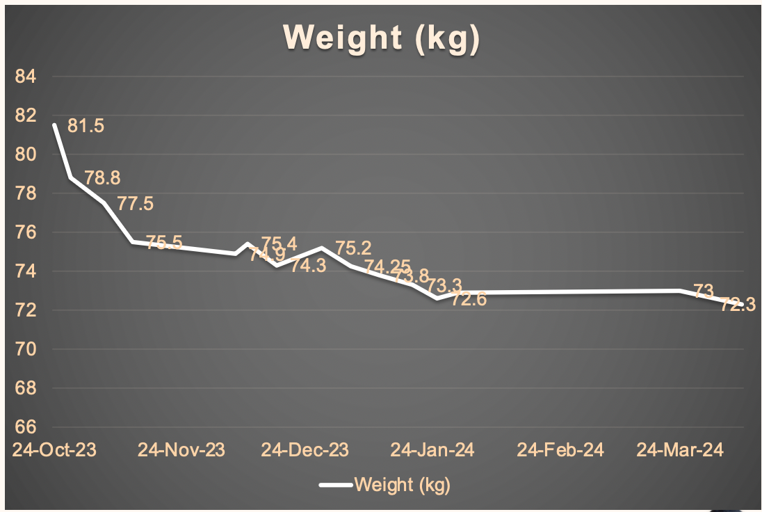 • 2023年11月までに、彼女はすでに数キロの減量に成功し、体重は75.5kgにまで減少した。これは、より健康的な食生活とアクティブなライフスタイルが効果を発揮していることの明確な兆候である。彼女の進歩は12月と1月を通して着実に続き、 72.6kgに達した。これは、彼女の強い規律と献身を反映している。