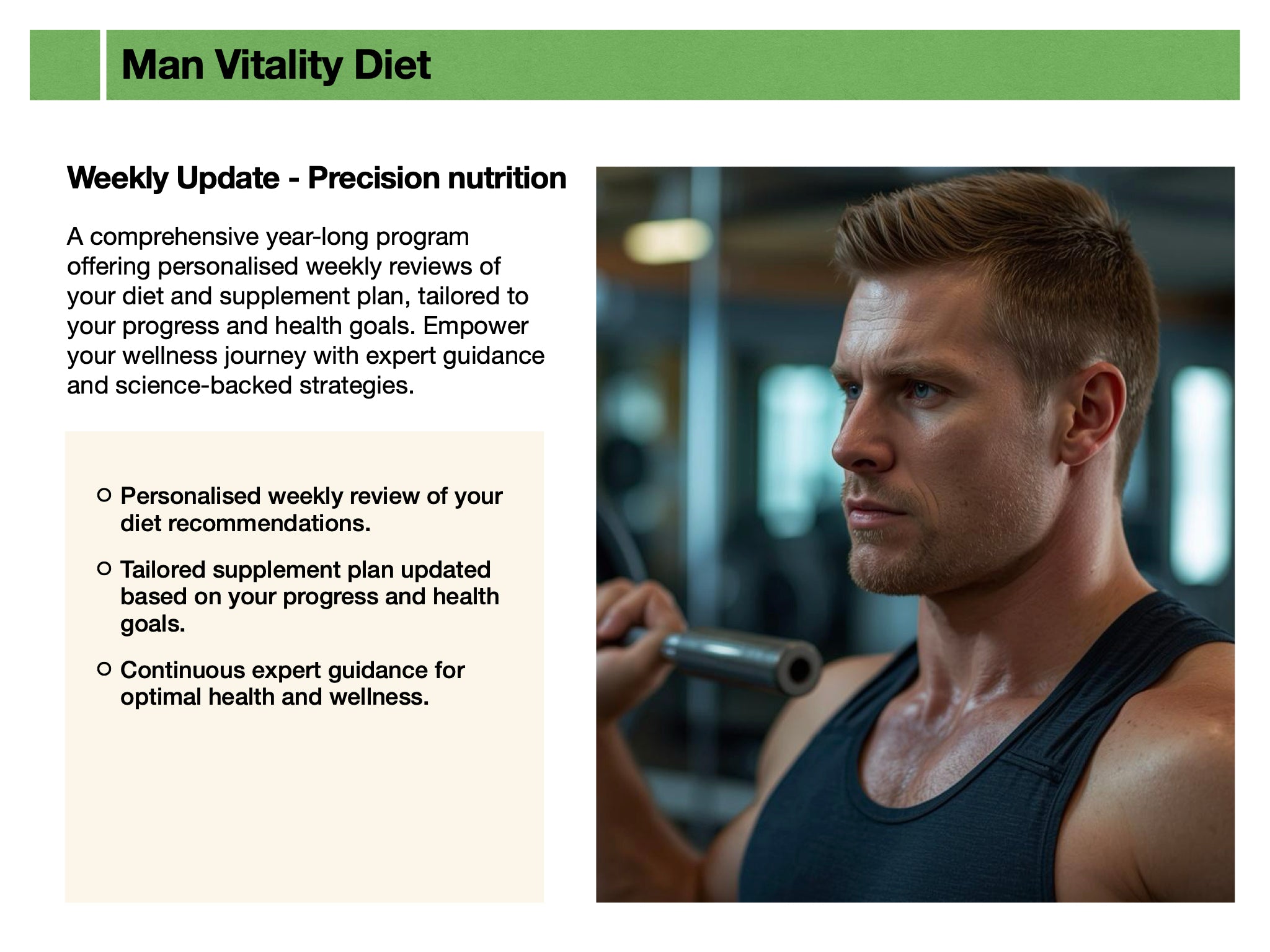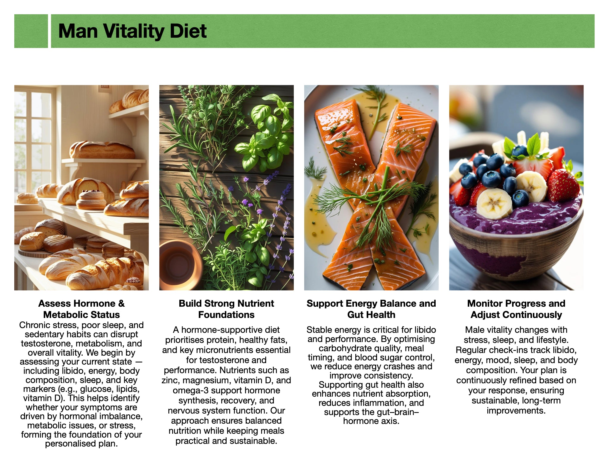 The Man Vitality Diet is a targeted nutrition program designed for men experiencing low libido, reduced energy, and hormonal imbalance. Rather than focusing on calories alone, this plan supports testosterone production, stress regulation, and metabolic health through strategic nutrient intake and dietary structure.